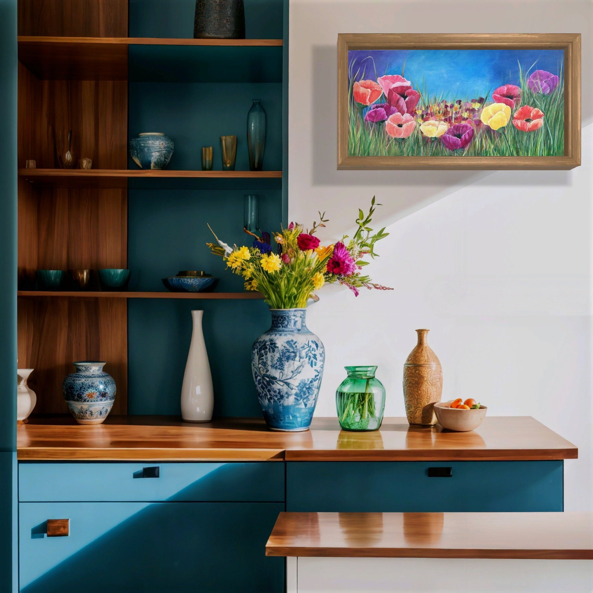 This captivating floral masterpiece bursts with life, showcasing an enchanting field of poppies in rich shades of red, pink, yellow, and purple. The vivid contrast between the bright blossoms and the deep blue sky creates a dreamy, immersive landscape. With delicate brushstrokes and a touch of realism, this painting radiates joy, serenity, and the untamed beauty of nature.