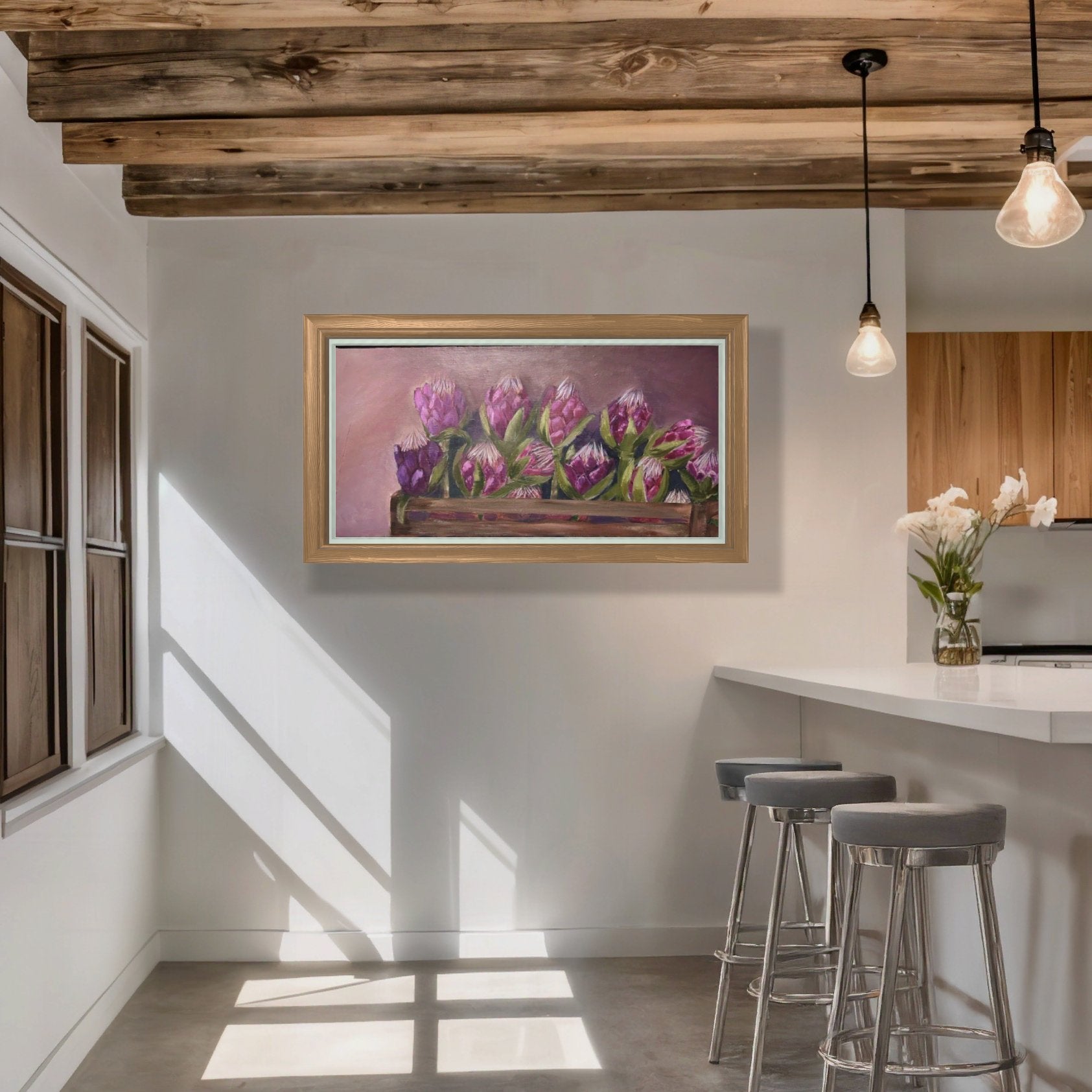 The Protea, often called the "King of Flowers," stands as a symbol of strength, transformation, and courage. I painted this piece thinking about strength not the kind that shouts, but the kind that blooms quietly, even when no one is watching. That’s when the protea came to mind. The crate holds more than flowers—it carries stories of resilience, healing, and quiet courage. Each brushstroke was a step toward peace, each petal a reflection of persistence. May this painting bring calm, strength, and color to your space, just as it did for me while creating it